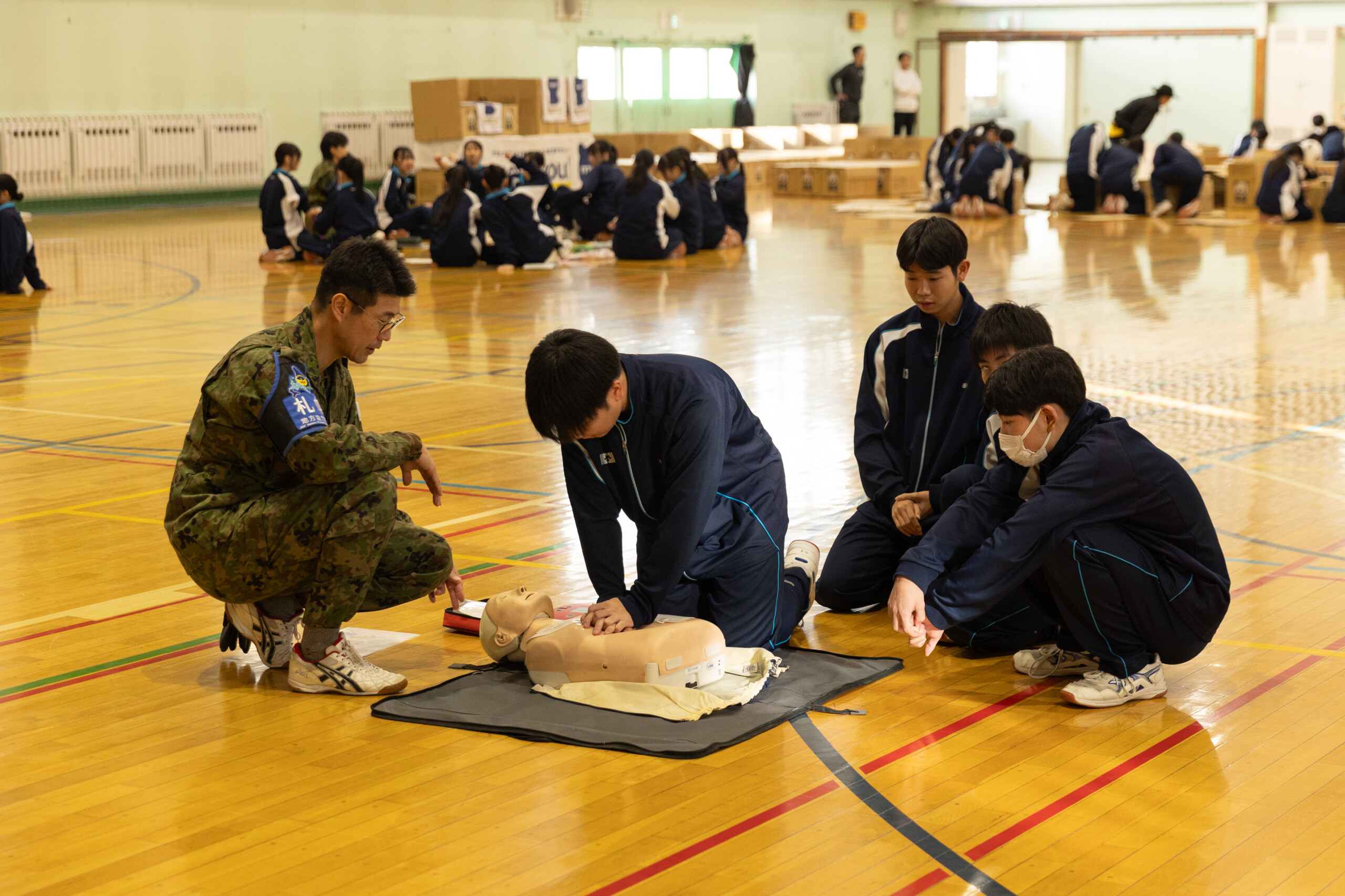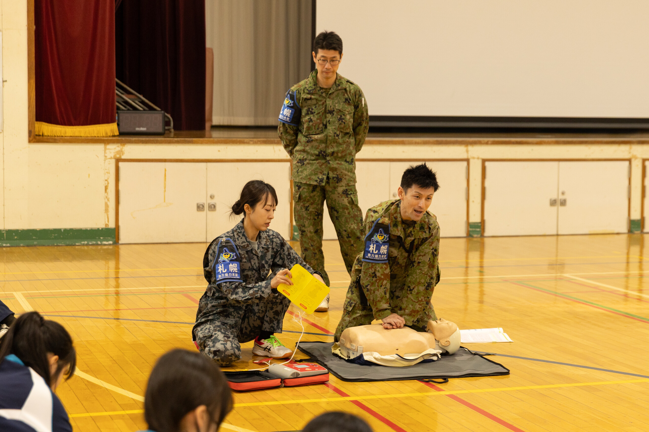 自衛隊札幌地方協力本部南部地区隊のみなさまの指導のもと、心肺蘇生法とAEDを用いた救命対応を実践。